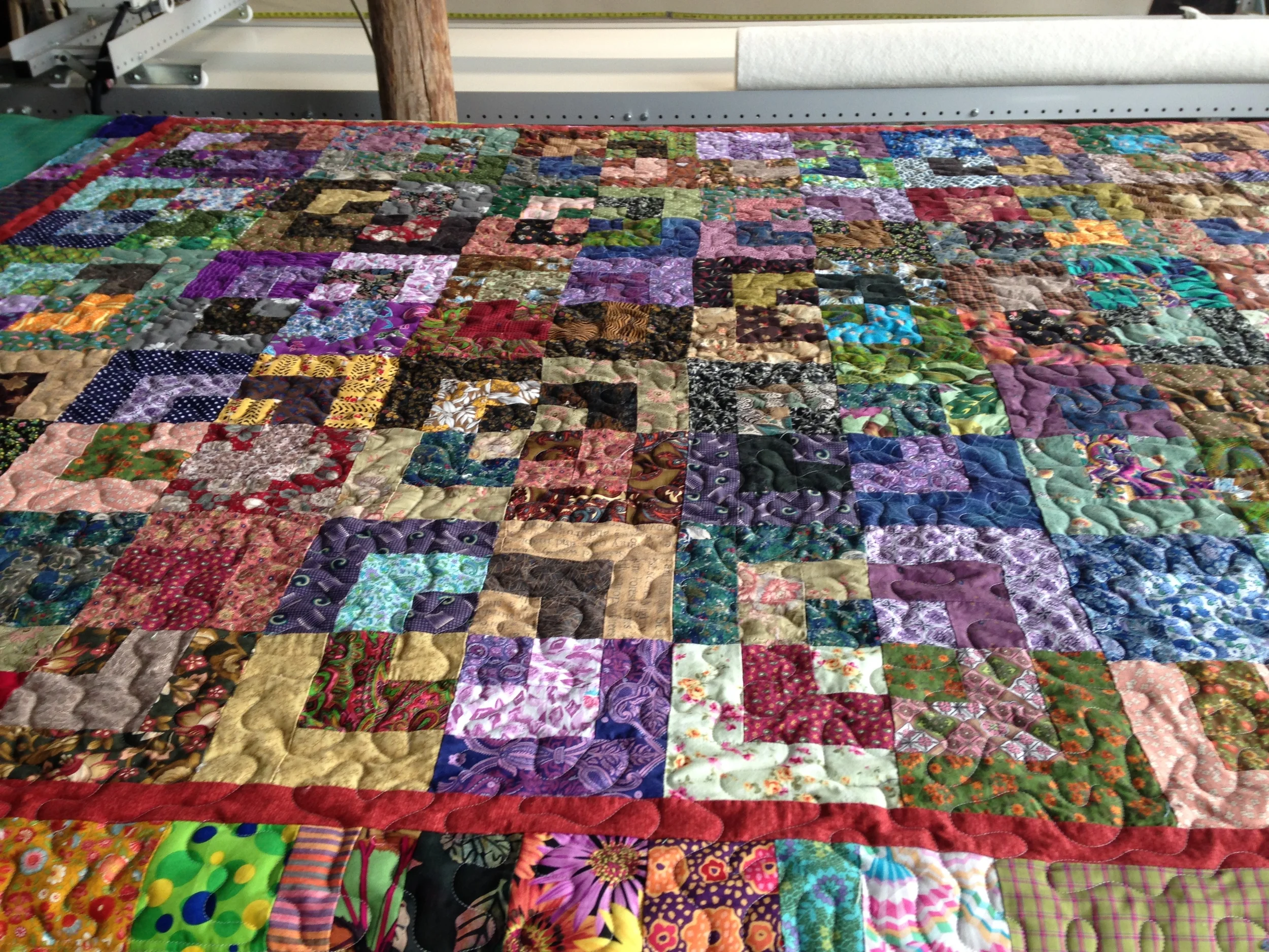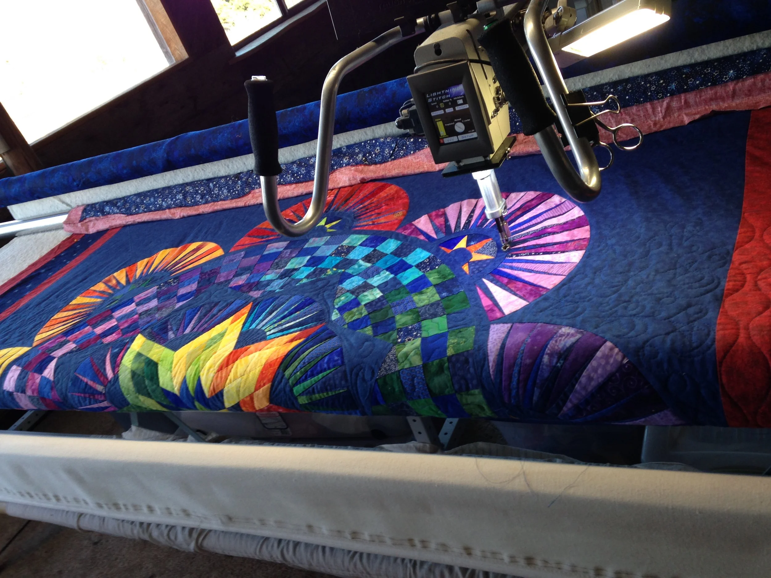 Quilting service. Beautifully designed quilt on quilting frame ready for free motion quilting.