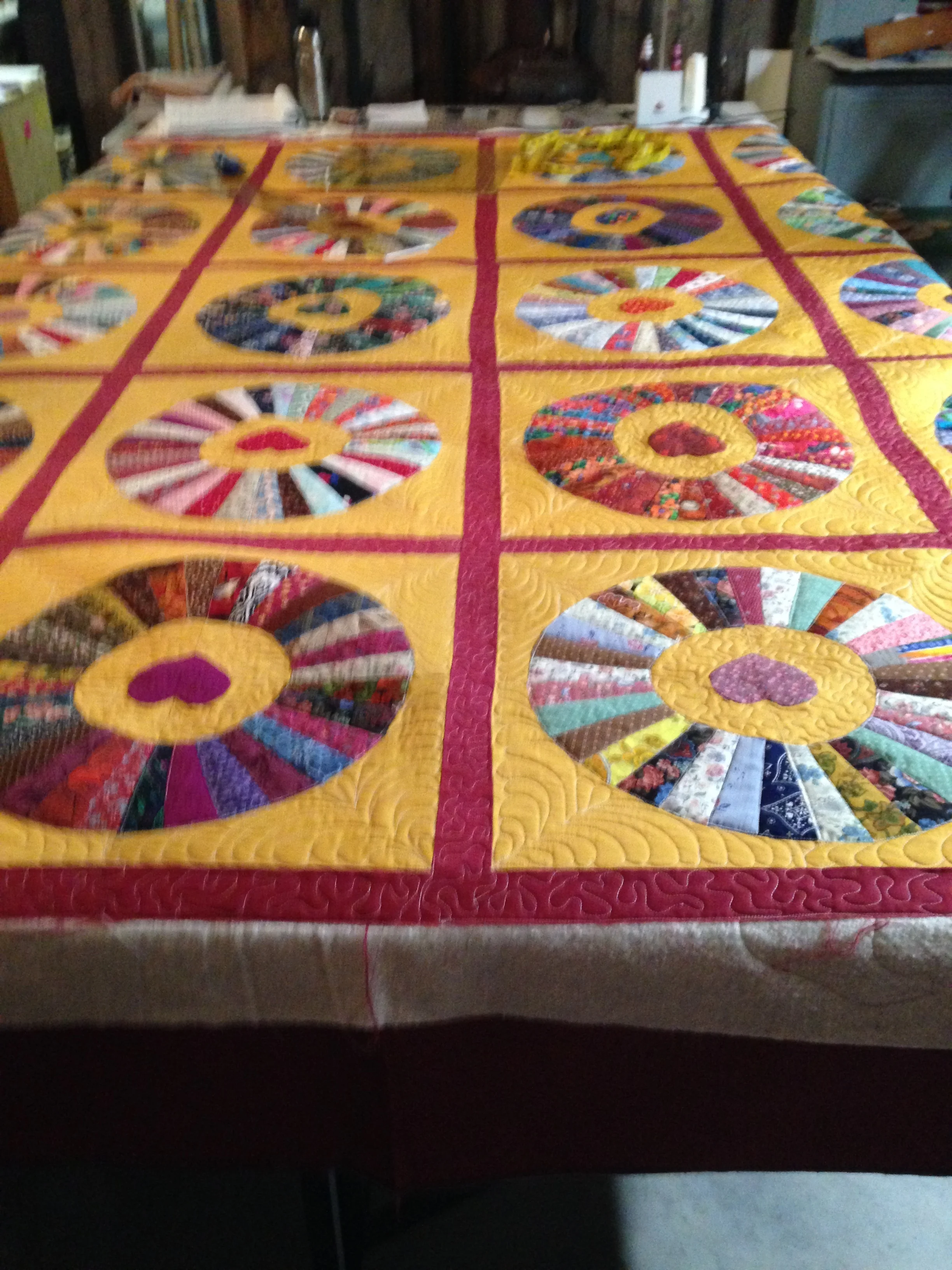 Custom made out of various colored cordoroy block sizes with appliqued circles added to it w/ circle quilt design.